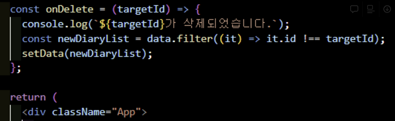 - data는 일기 데이터 객체를 담고 있는 배열인데, filter함수를 이용하면 각 일기 데이터 객체의 id값이 targetId가 아닌 객체들만을 모아서 새로운 배열을 만들 수 있다.