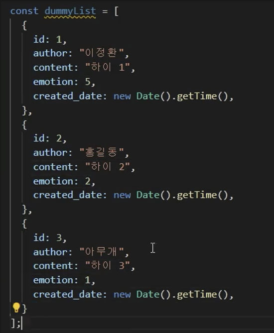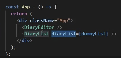 - dummylist를 prop으로 전달하여 DiaryList 컴포넌트에서 diaryList라는 이름으로 dummylist 배열을 사용한다.