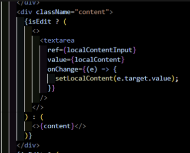 3. 삼항연산자를 이용해 수정버튼을 누르면 content가 textarea로 바뀌어 값을 입력할 수 있도록 한다.