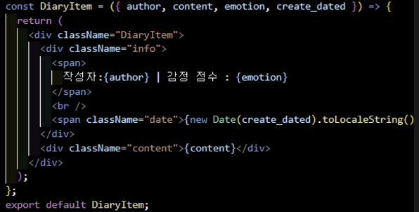 - DiaryItem 컴포넌트에서는 prop으로 전달받은 객체들을 비구조화 할당을 이용해 각각 키를 이름으로 하는 변수로 저장하여 사용한다.