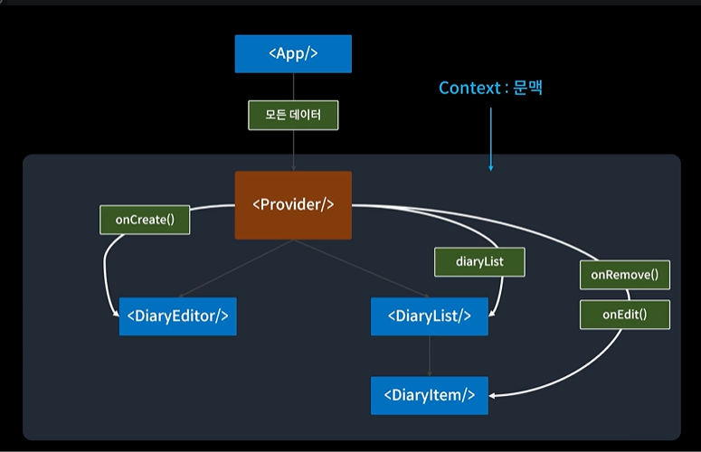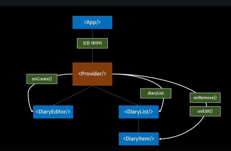 - Provider도 결국 컴포넌트이므로 prop이 바뀌면 재생성 된다. Provider 컴포넌트가 재생성 되면 밑에 있는 컴포넌트가 전부 강제로 재생성 된다. value에 onCreate, onEdit, onRemove를 넣으면 data state가 바뀔 때마다 리렌더링이 일어나게 되어 최적화가 다 풀리게 된다.