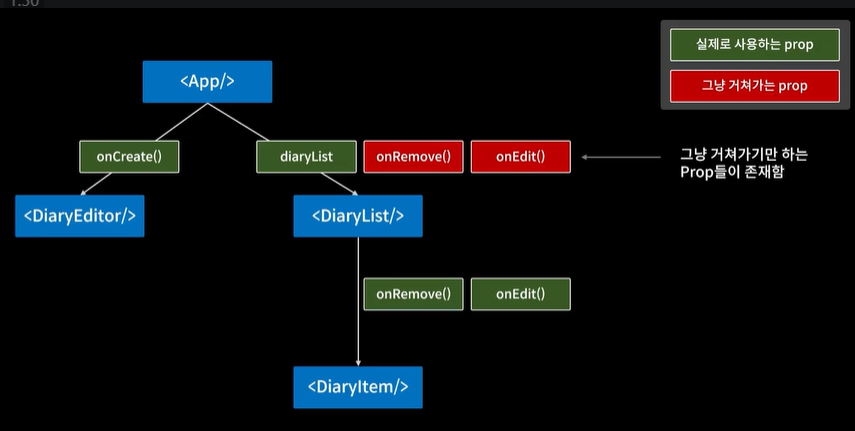 - 부모에서 자식으로만 데이터를 전달하는 단방향 데이터 흐름을 지키는 React의 특성 때문에 props drilling이 일어난다.props 이름 바꾸기도 어렵고 코드 작성과 수정에 악영향을 끼친다.