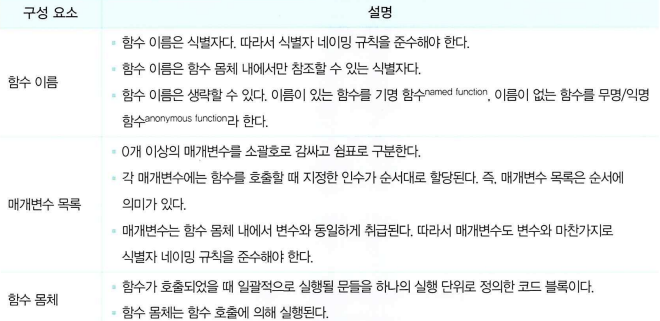 - 함수 정의 : 함수를 호출하기 이전에 인수를 전달받을 매개변수와 실행할 문들, 반환할 값을 지정하는 것을 의미.