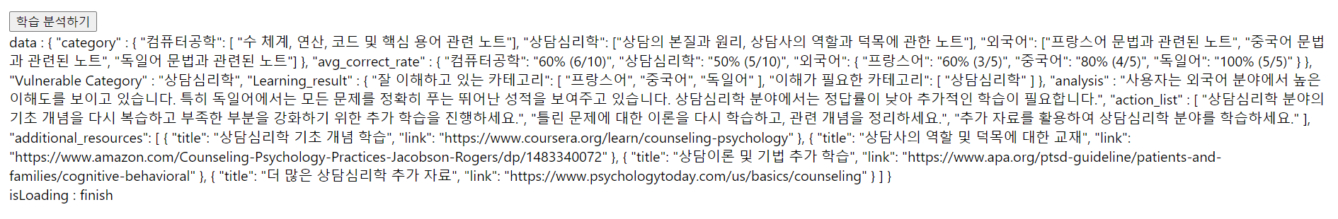결과를 보면 알 수 있듯, 분류도 잘 되어있고, 정답률도 잘 계산되어 취약한 카테고리도 잘 보여주고 있다. 또한, 상담심리학이 가장 정답률이 낮은 것을 인식하고 상담심리학과 관련된 추가 자료를 제시해주고 있다.